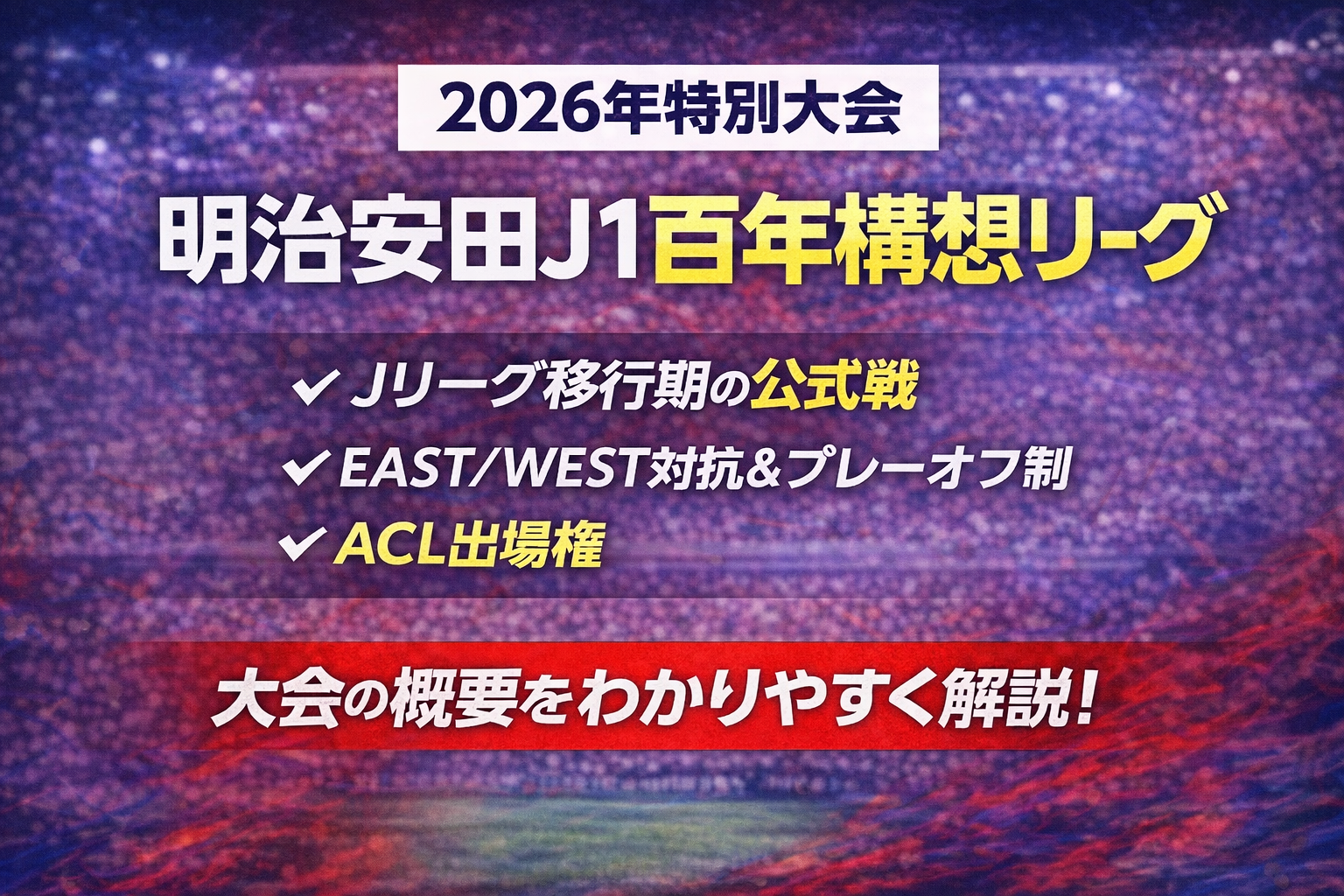 2026年シーズンに実施される「明治安田J1百年構想リーグ」は、通常のリーグ戦とは異なる特別大会。 これはJリーグが2026/27シーズンから秋春制(8月〜翌5月)の新フォーマットに移行するため、**その上半期に行われる公式戦**として設けられている。